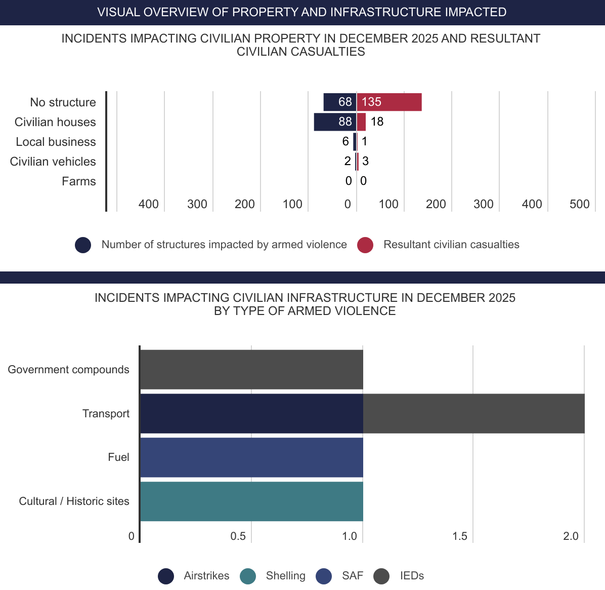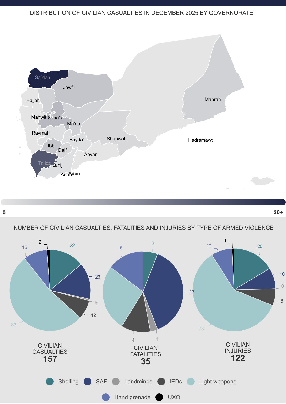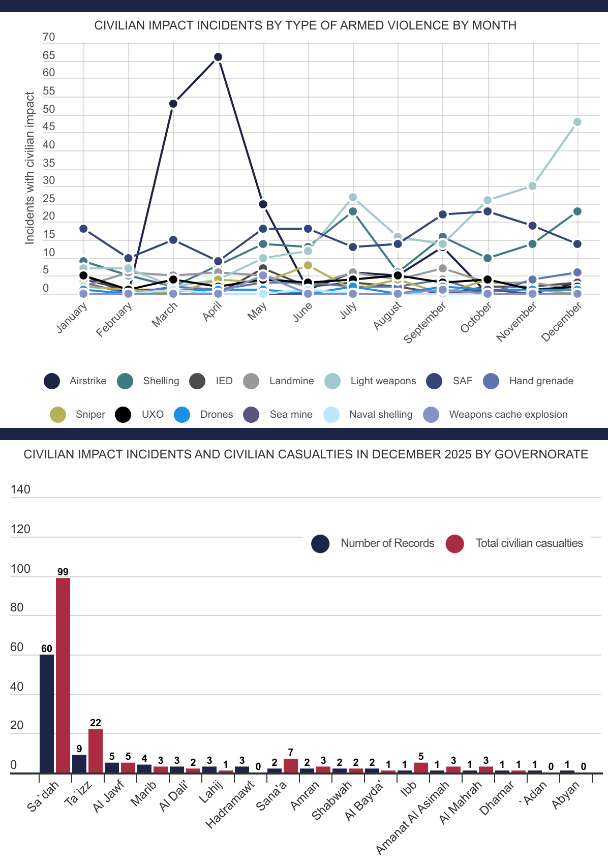 This is the Civilian Impact Monitoring Project monthly visual and analytical report, providing an overview of all incidents of armed violence reported to have had a direct impact on civilians in Yemen in December 2025. The report covers civilian casualties, incident distribution, type of armed violence and impact upon civilian property and infrastructure.